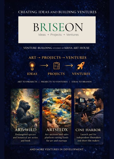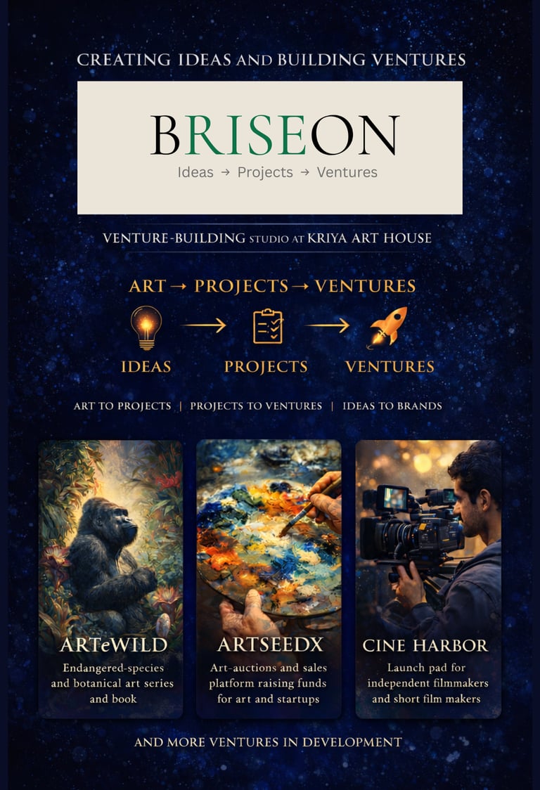 BRISEON is the venture studio section under incubation within Kriya Art House, focused on turning art into projects, projects into ventures, and ideas into brands. It is conceived as a studio for building original concepts with structure, direction, and long-term potential, especially where creative vision can grow into more defined cultural, commercial, or venture-led outcomes.